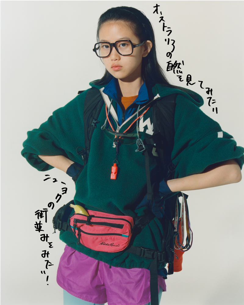 〈ヘリル〉プルオーバー ¥143,000、〈ヴィンテージ〉メガネ ¥27,500(にしのや Tel.03-6434-0983)、〈マービンポンティアックシャツメイカーズ〉シャツ ¥49,500、〈クレプスキュール〉ヘアバンド ¥5,000、〈グルメジーンズ〉中に履いたパンツ ¥30,800、ベルト ¥27,500(オーバーリバー info@overriver.com)、〈エル・エル・ビーン〉キャンプピロー ¥4,290(L.L.Beanカスタマーセンター Tel.0422-79-9131)、〈ユーズド〉ショーツ ¥11,000、リュックに掛けたアウター ¥14,300(サファリ4号店 Tel.03-5913-8377)、〈ヴィンテージ〉時計 ¥657,800(エグチトケイテン Tel.03-5422-3070)、〈エリべ〉グローブ ¥7,150(ビショップ Tel.03-5775-3266)