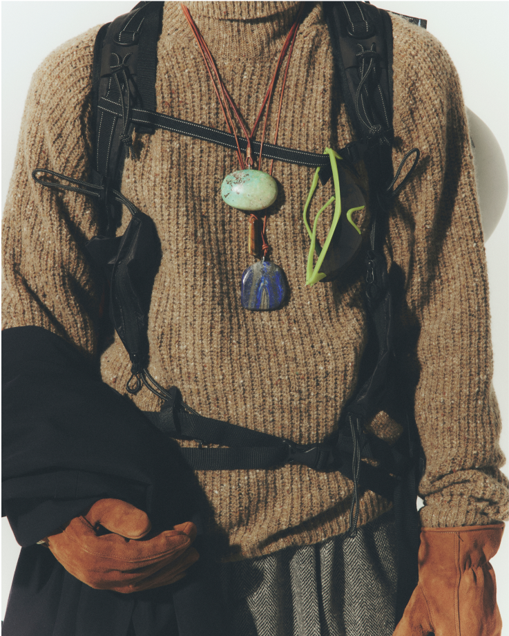 〈ノア〉ニット ¥44,000、ニット帽 ¥7,700(ノア クラブハウス Tel.03-5413-5030)、〈ビズビム〉パンツ ¥127,600(ビズビム Tel.03-5468-5424)、〈ビズビム〉手に持ったジャケット ¥220,000、グローブ ¥42,900(エフ アイ エル オモテサンドウ Tel.03-5778-3259)、〈ニューバランス〉シューズ ¥19,800(ニューバランスジャパンお客様相談室 Tel.0120-85-7120)、〈マシュー スウォーブ ジュエリー〉ネックレス 各¥12,100(スティーブン アラン フタコタマガワ Tel.03-5491-7511)、〈ディストリクト ヴィジョン〉サングラス ¥49,500(ブリンク ベース Tel.03-3401-2835)