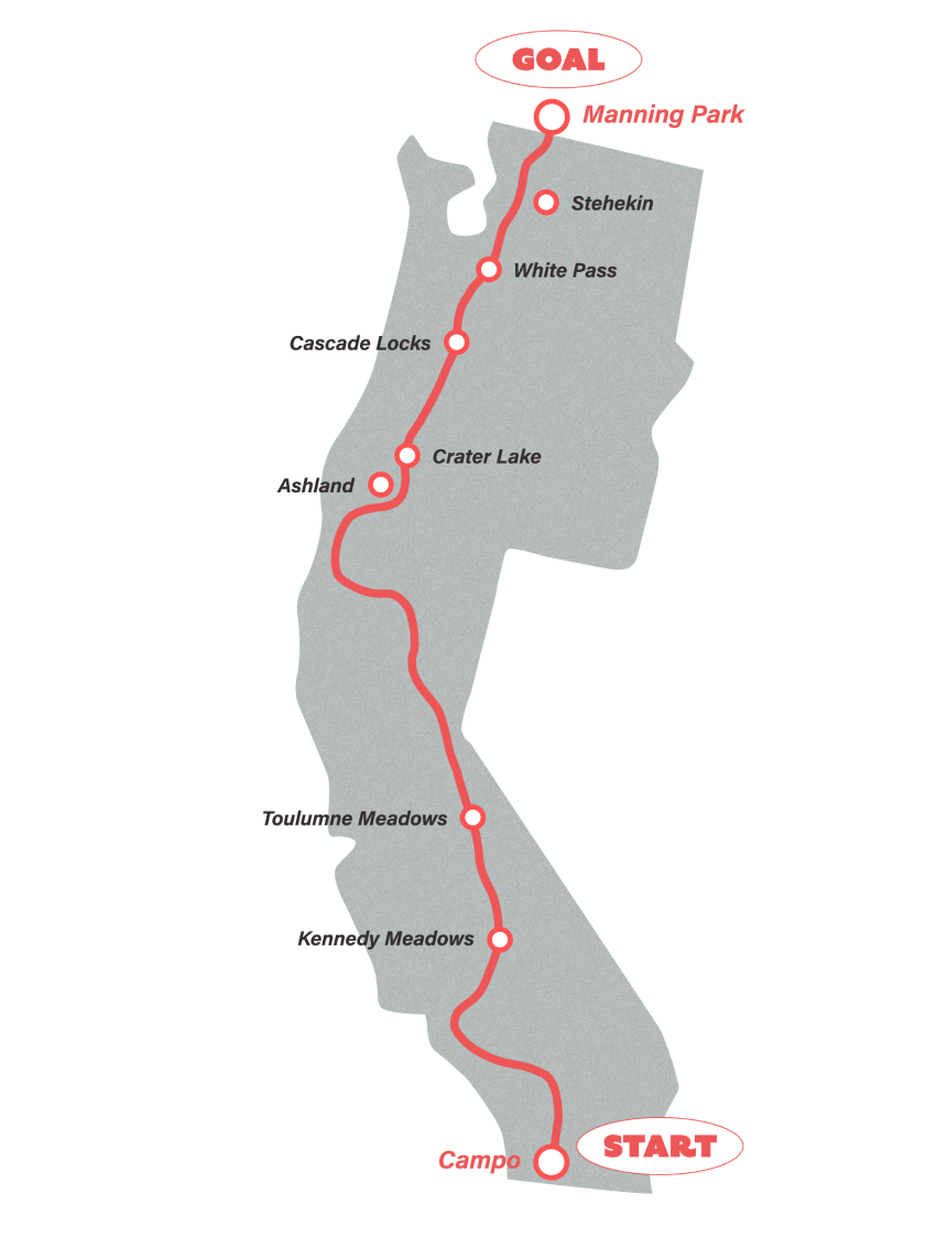 メキシコ国境からカナダ国境までの約4300キロを繋ぐパシフィック・クレスト・トレイル(PCT)。スルーハイキングに要する期間は4〜6ヶ月間で世界有数の長距離トレイル。コンティネンタル・ディバイド・トレイル(CDT)、アパラチアン・トレイル(AT)と並ぶ、アメリカ三大トレイルのひとつ。増田翔さんは南から北へと抜けるNORTH BOUNDで歩いた。