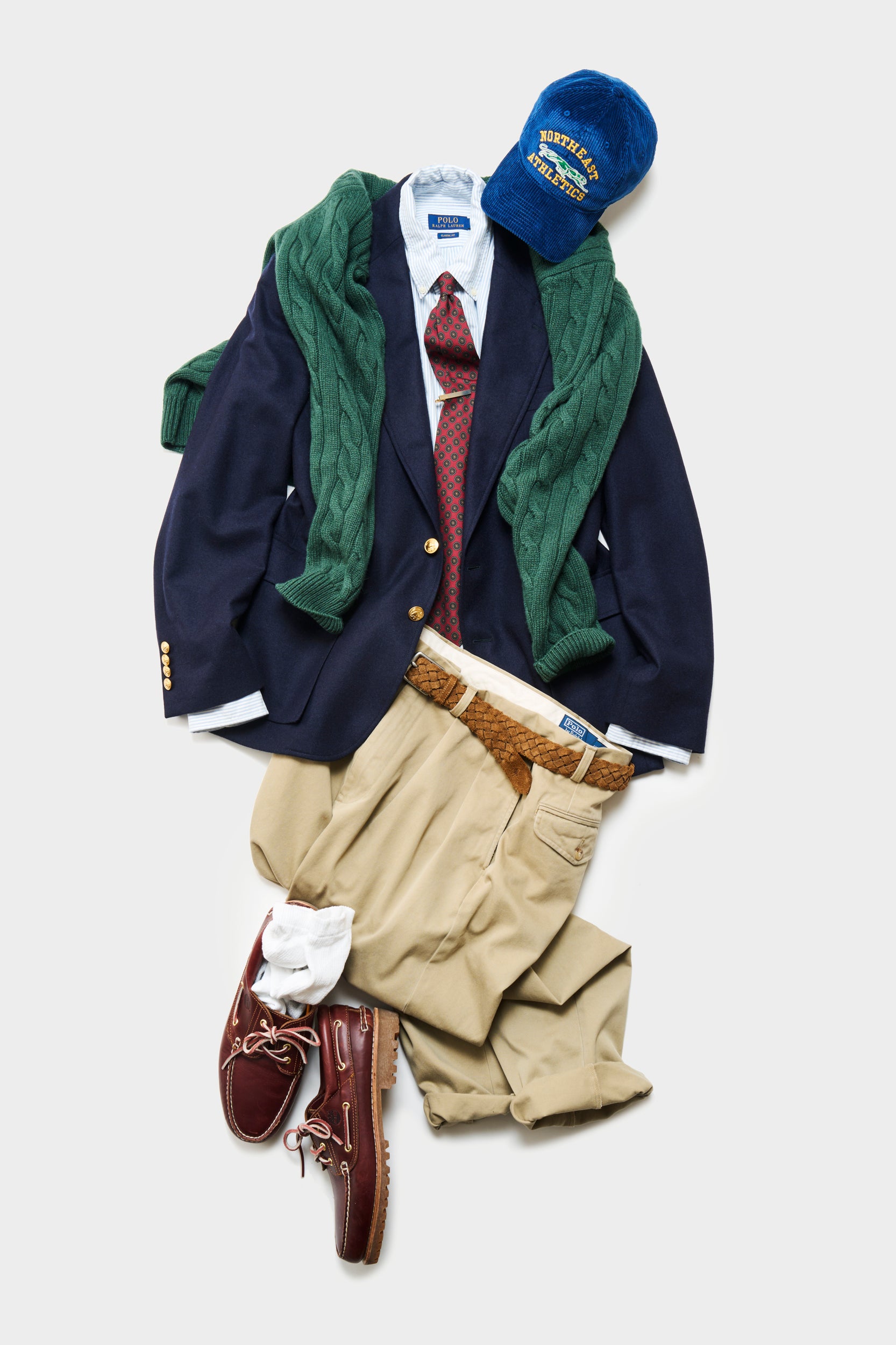 アメトラの王道ブランド〈ポロ ラルフ ローレン〉の紺ブレを使ったスタイリング。ラルフ・ローレンの愛用品であるスポーツジャケットから着想を得た「RL67」というモデルだ。特別に開発されたブラッシュ加工のウールフランネルを使用した一着は、胸からウエストにかけてのシェイプが美しい。オックスフォード生地のボタンダウンシャツにタイドアップしながらも、チノパンを合わせるスタンダードな崩し。足元は〈ティンバーランド〉の3アイレットを選んだところもこだわりだ。小物でスポーティな要素を入れ込んだら、完成。これなら間違いなくゴルフ場へ行っても恥をかかないだろう、それにヒップだ。