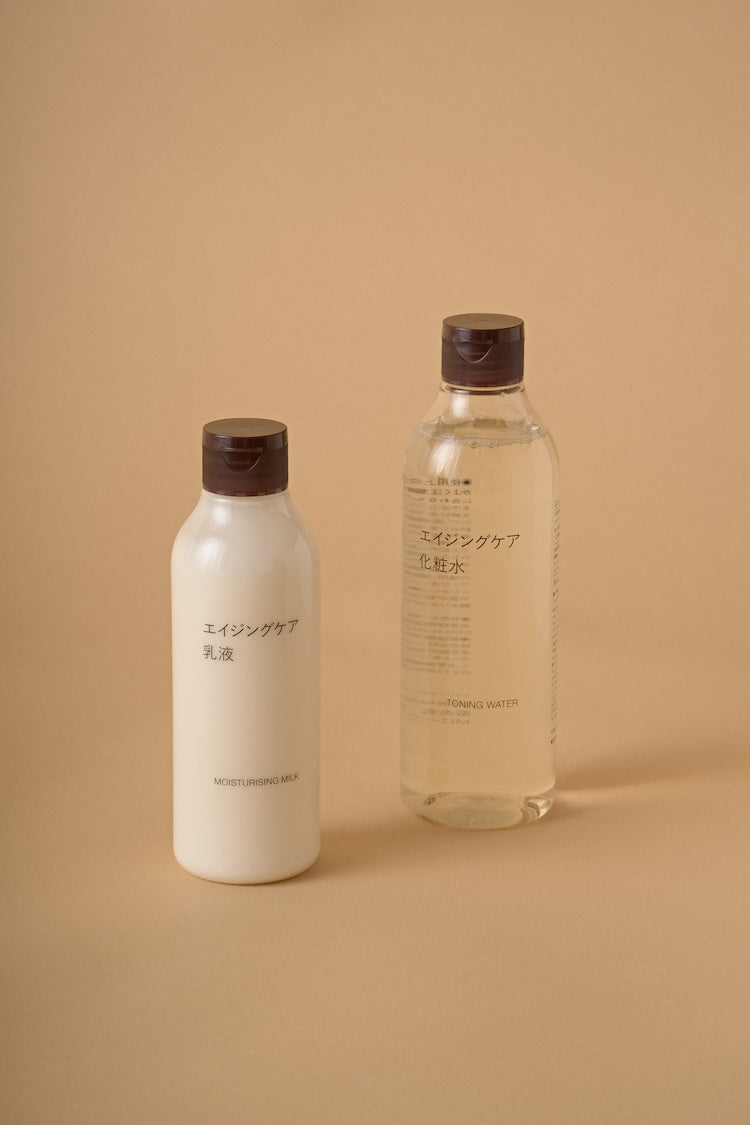 雑貨も家具も収納も、そして洋服もラインナップしている〈無印良品〉は、かゆいところに手が届いたアイテムが充実。評判のコスメ・ケア用品を覗いてみると、もちろんありました、エイジングケアに特化したシリーズが。「エイジングケア化粧水」と「エイジングケア乳液」は、潤い成分として米ぬか発酵液と11種の植物エキス、ビタミンC誘導体、レチノール誘導体を配合。乾燥が気になる肌に潤いを与え、ふっくらとしたハリのある肌に導く。ほかの買い物ついでに手軽に買えて、価格も手頃。潔いパッケージのデザインも、気負わない雰囲気で身近に感じるポイントに。