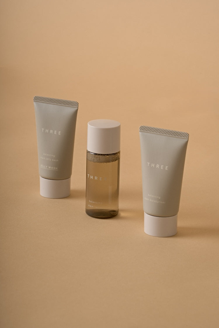 オーガニックと国産原料にこだわり、天然の精油を配合したスキンケアを展開している〈スリー(THREE)〉。メンズコスメも充実していますが、まずは「バランシングステム スキンケア ファーストキット」でお試しを。洗顔料の「バランシングステム ジェリー ウォッシュ 22g」、化粧水の「バランシングステム ローション 28ml」、乳液の「バランシングステム モイスチャライザー 22ml」がセットになっているから、エイジングケア入門には持ってこい。男性に多い混合肌や脂性肌に最適な成分が配合されていて、香りはグリーンハーバルな天然ブレンド精油の香調で仕上げている。