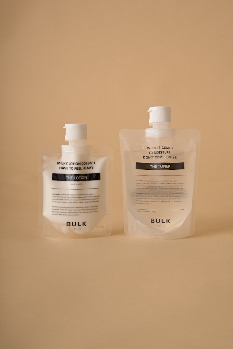 メンズスキンケアのベーシックを追求する〈バルクオム(BULK HOMME)〉。製品名のすべてに“THE”がついているのは、ベーシックであることへの自信の表れ。パウチのパッケージも、バルク(中身)で勝負するというアイデンティティが表現されている。「THE TONER」は、高い保湿力を持ちつつ、男性でも使いやすい低刺激タイプの化粧水。「THE LOTION」は、肌に最適な水分 & 油分バランスを供給することをコンセプトに研究開発された、ベタつかずサラっとした使い心地の乳液。どちらも男性の肌のために誕生したのだから、効果に期待せずにはいられない、頼りにしたくなる存在だ。