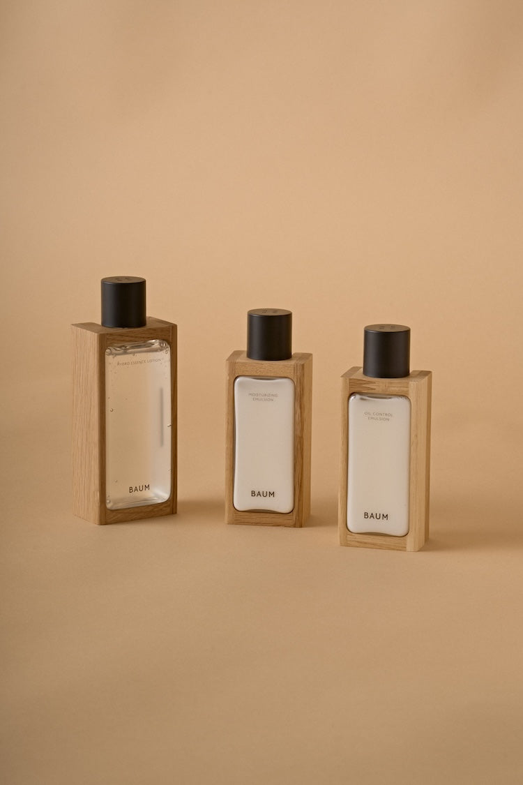 〈バウム(BAUM)〉も〈IPSA〉と同じく、〈資生堂〉が展開しているブランドのひとつ。まず目に留まるのは、木製パーツが印象的な小洒落たボトル。木製パーツは〈カリモク家具〉とのコラボレーションで、家具製造の過程で出る端材を使用している。そのボトルこそ、〈バウム〉のテーマである“樹木との共生”を体現する。もちろん、樹木の恩恵は成分にも。ひのきの幹や枝から抽出した貴重なエキス“ひのき水”が配合され、肌にたっぷりと潤いを提供。天然ひのき香料をモダンに調香した香りも心地いい。