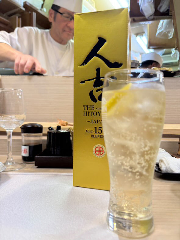 お酒もまた楽しみのひとつ。まずはビールから始まり、焼酎や日本酒へ。なかでもおすすめは、熊本の米焼酎「人吉(ひとよし)」。ブランデーのような香りがあって、寿司との相性も抜群なんです。実はこのお酒との出会いも「福ずし」ならでは。隣に座っていたマダムに勧められて、蔵元の社長さんまで紹介してもらいました。