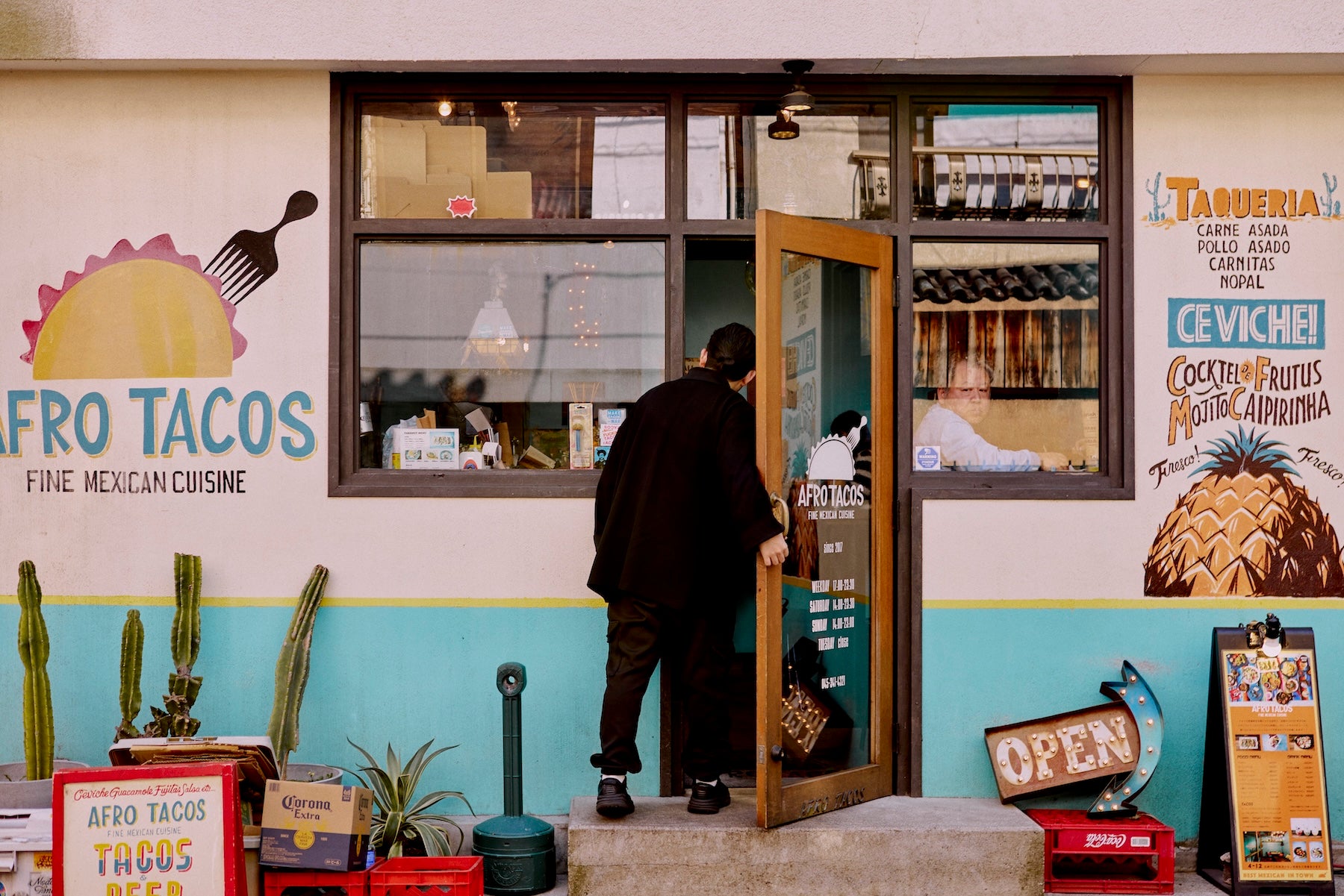 Sunday in Noge. Glancing at the men and women of all ages getting drunk in the middle of the day, our group entered the fashionable and stylish "AFRO TACOS," which seemed a little out of place in this drinking town. As we savored the delicious and beautiful-looking tacos, we asked Tom, who usually drives a car, about the appeal of cars.