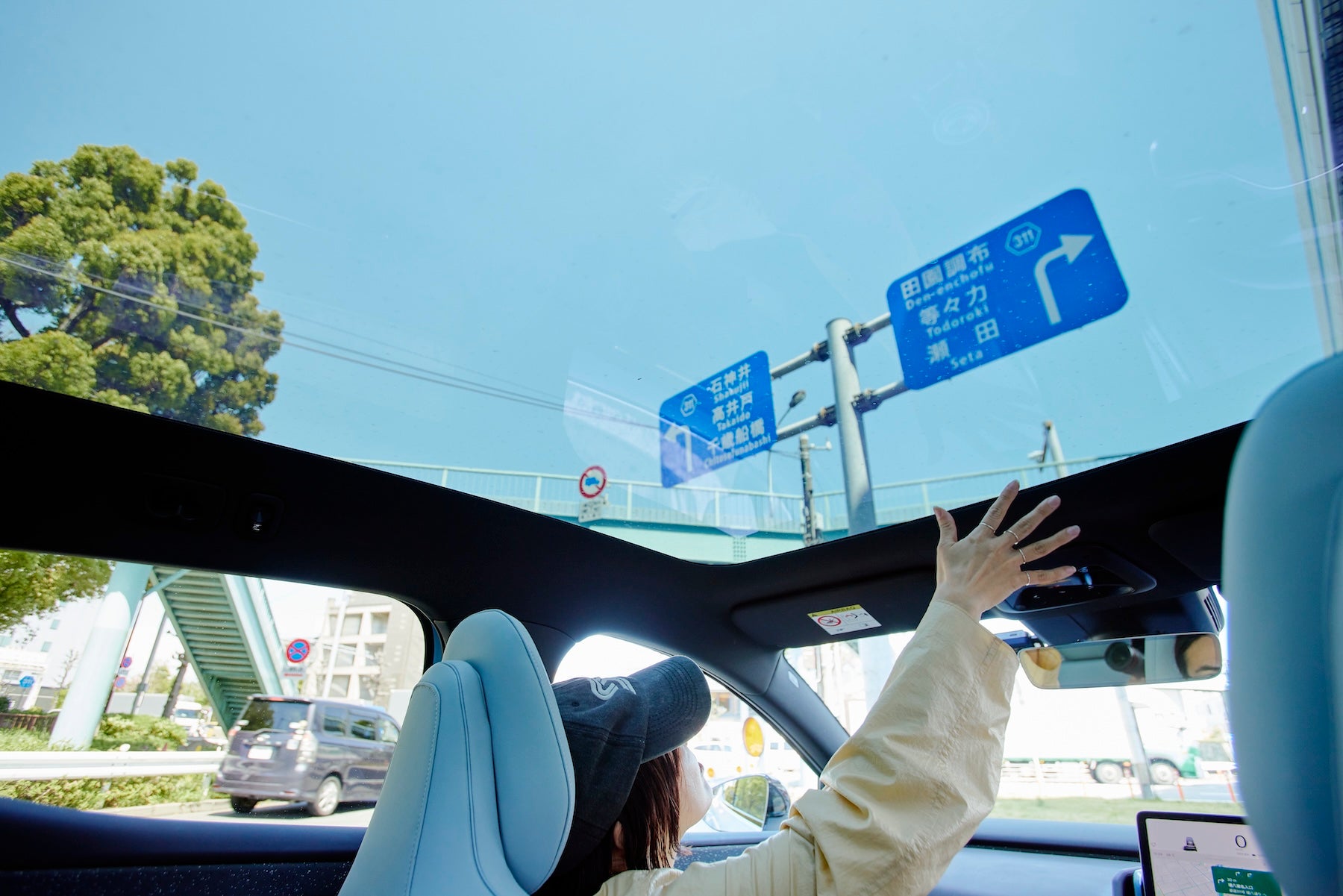 "By the way, the weather is perfect today. Look, you can see from inside the car that there isn't a single cloud in the sky. This car gives you a great feeling of openness."
