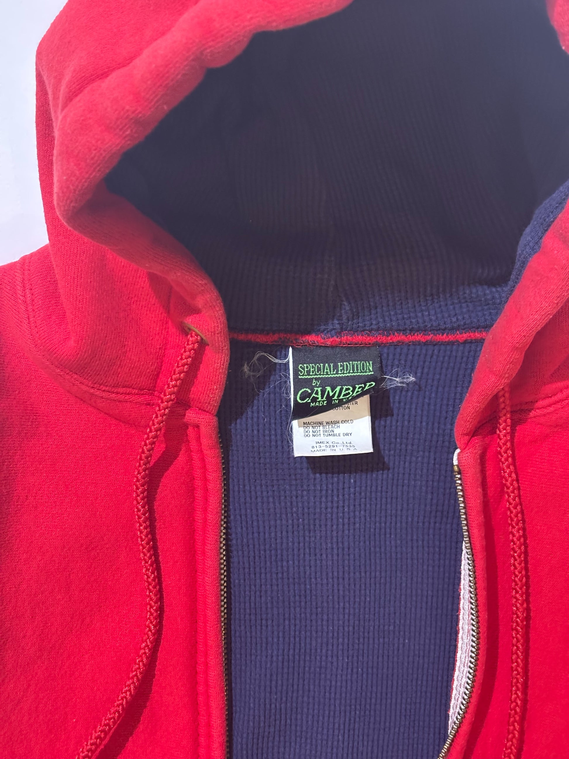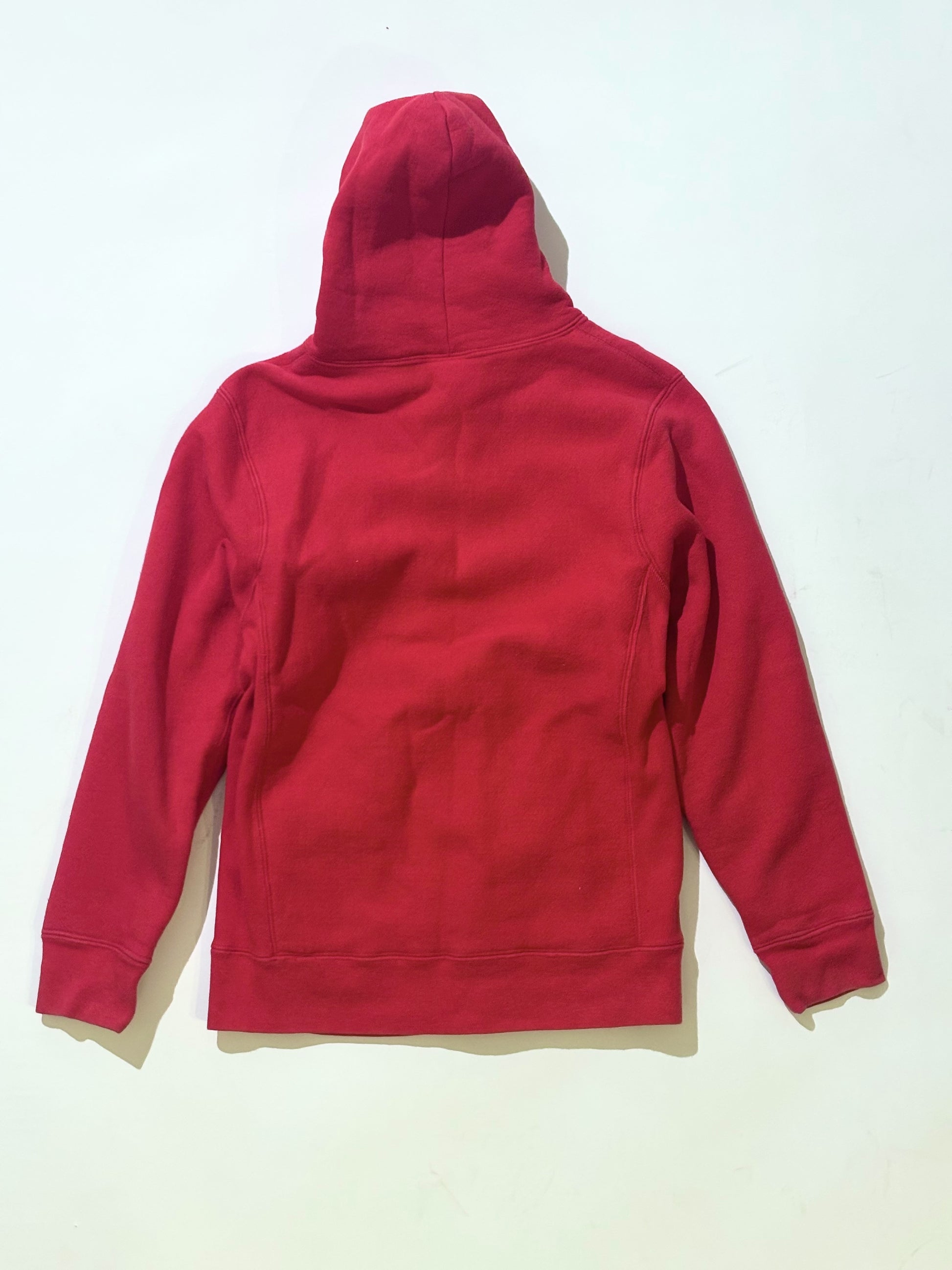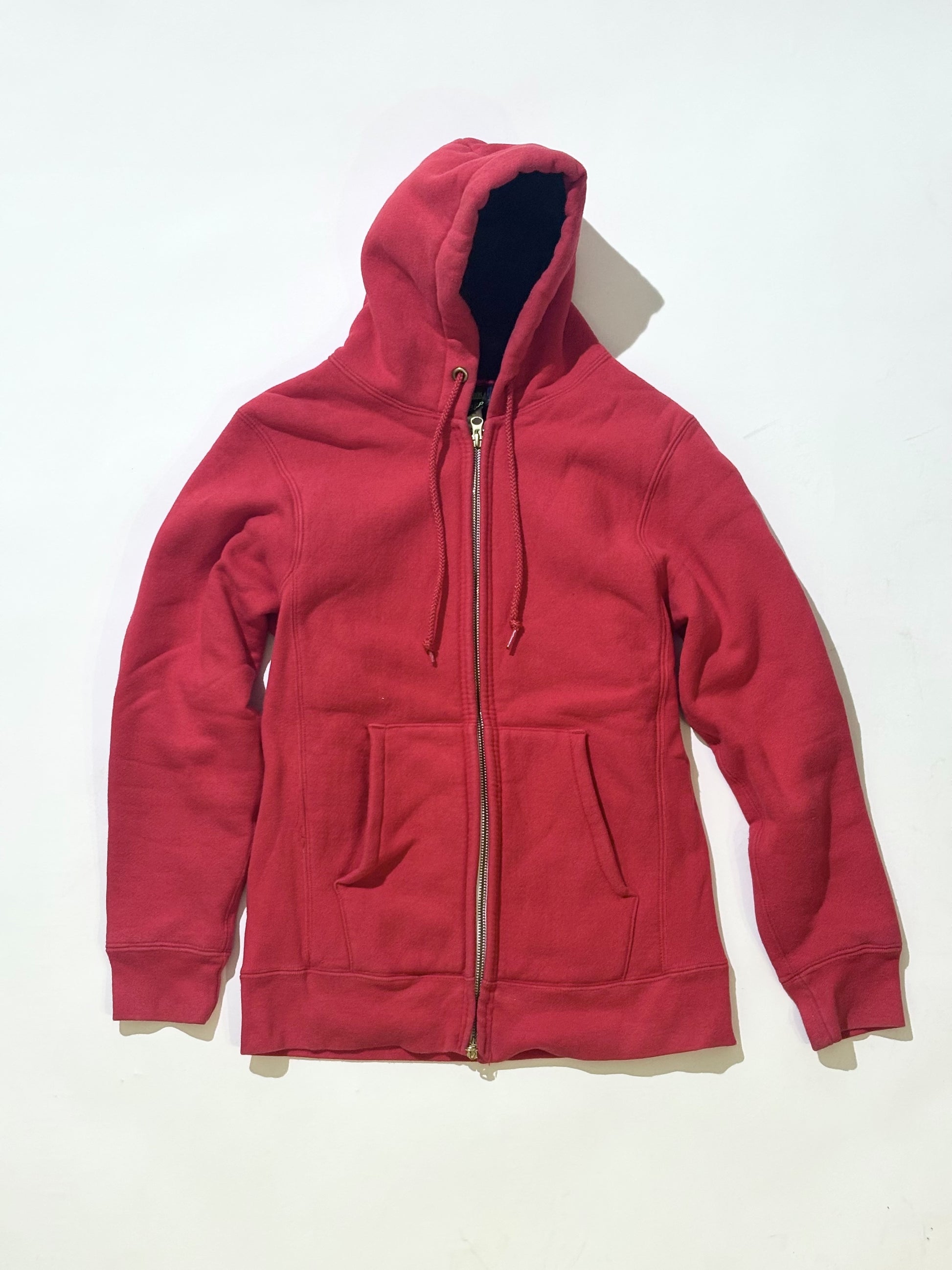 赤に裏地は紺のジップフーディーは日本企画のシルエットなので少し細めになります。