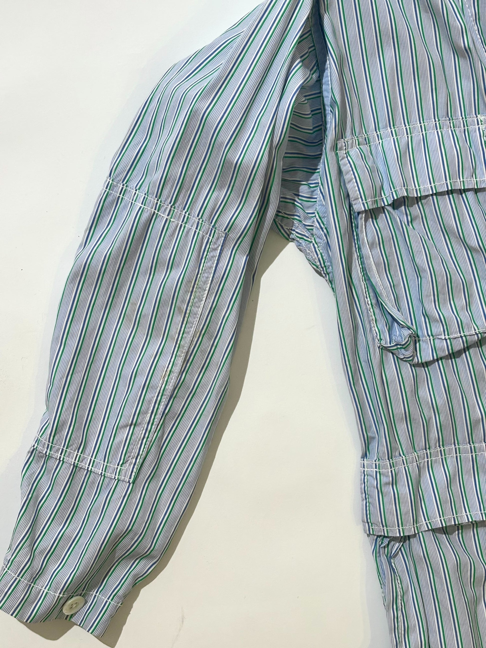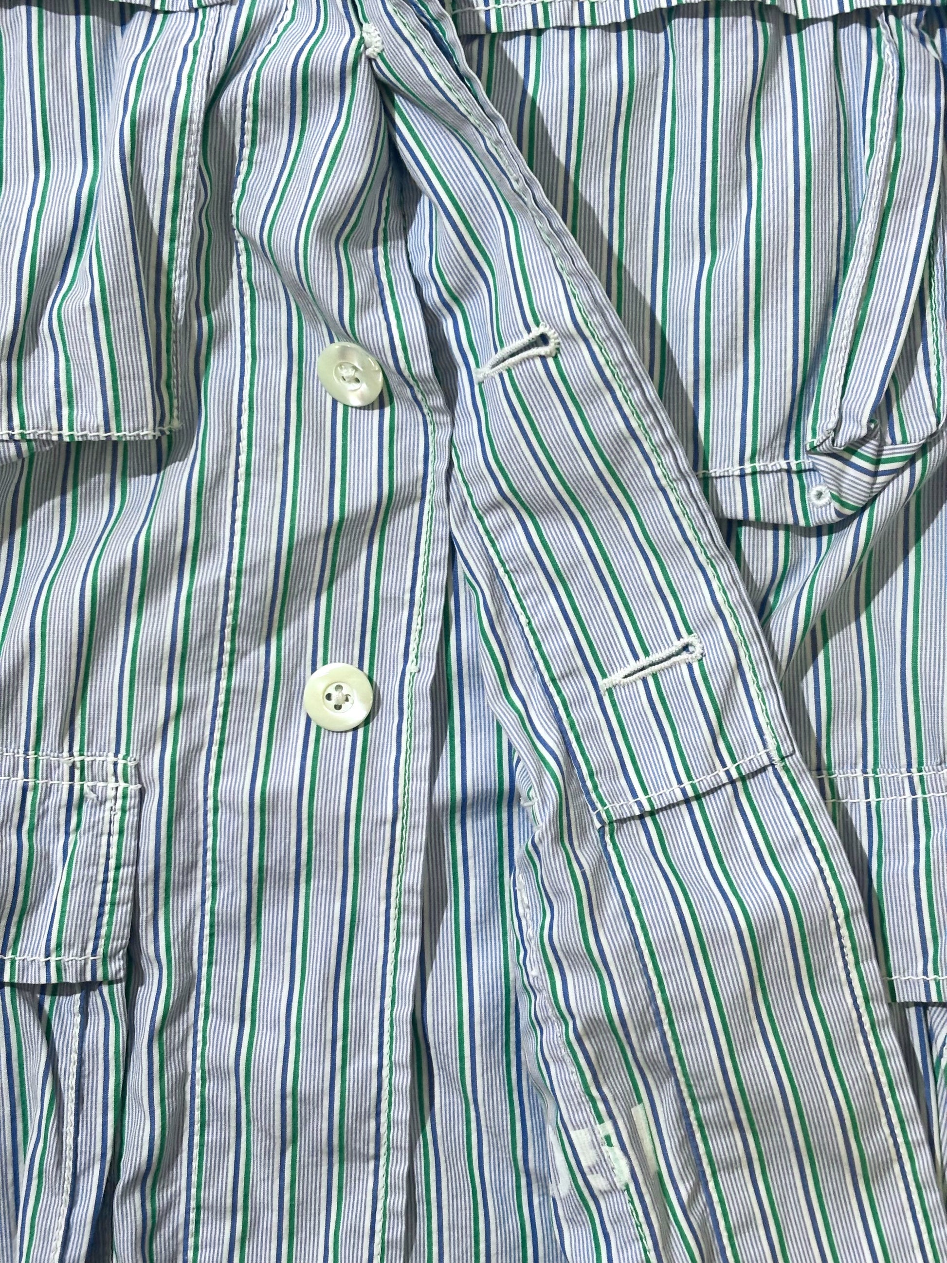 絶妙なストライプのファティーグの形のジャケット。ポケットのつくりが非常に凝っていて面白い仕様になってます。生地的にも通年着れるやつです。