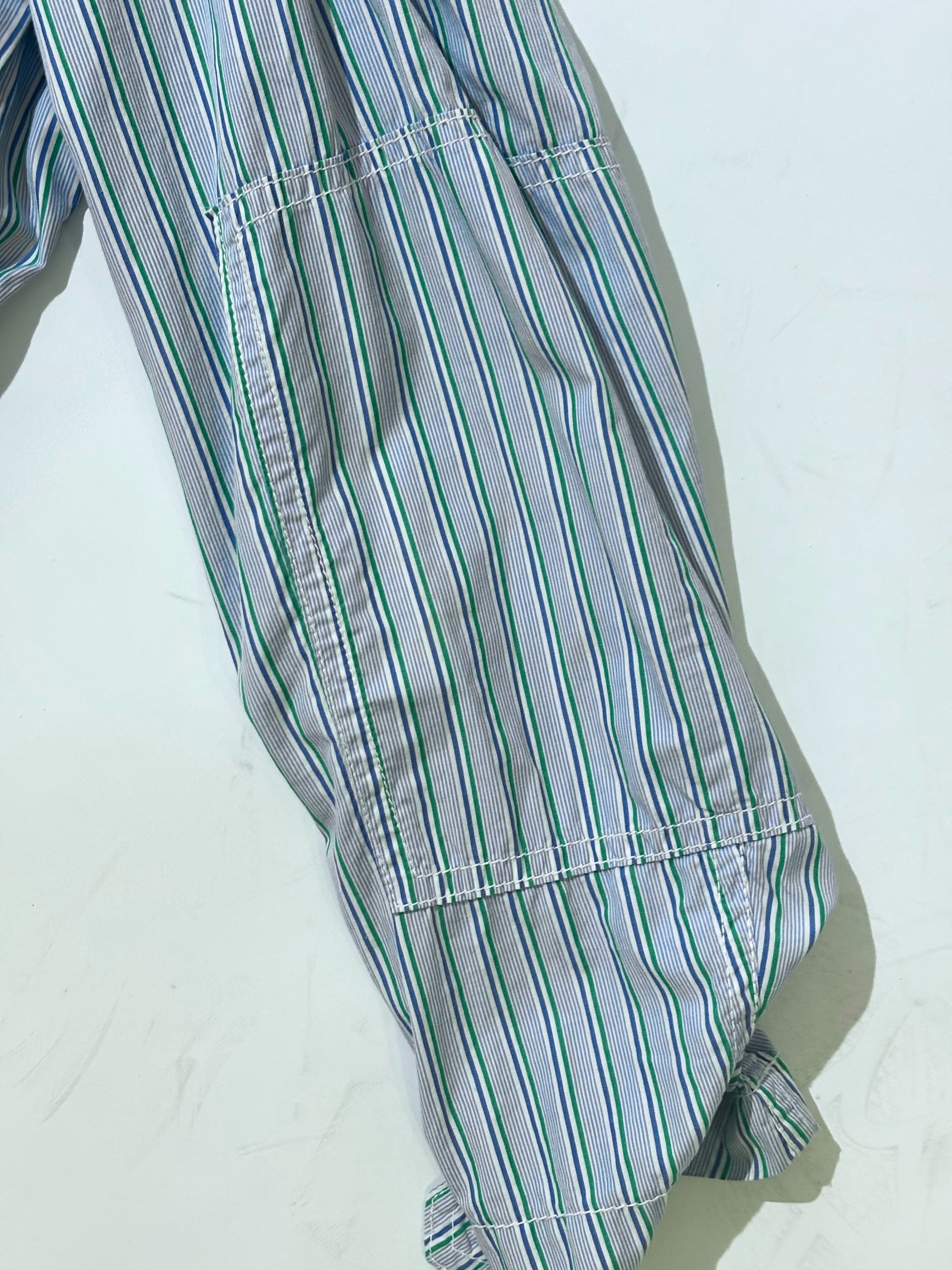 編集部より:2002年に始まった〈コム デ ギャルソン ジュンヤ ワタナベ マン〉が、2003年に発売したシャツ生地のファティーグジャケット。ストライプと比翼仕立てで、ミリタリー・ワークな雰囲気は少なめ。でも、マチありポケットでしっかり入るというがポイントです。パーカなんかを中に着たり、コートのインナーに使うのもよいのでは。襟と両袖に汚れがあるので、漂白チャレンジを!