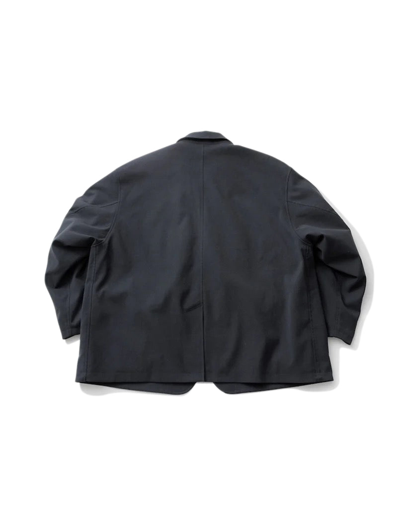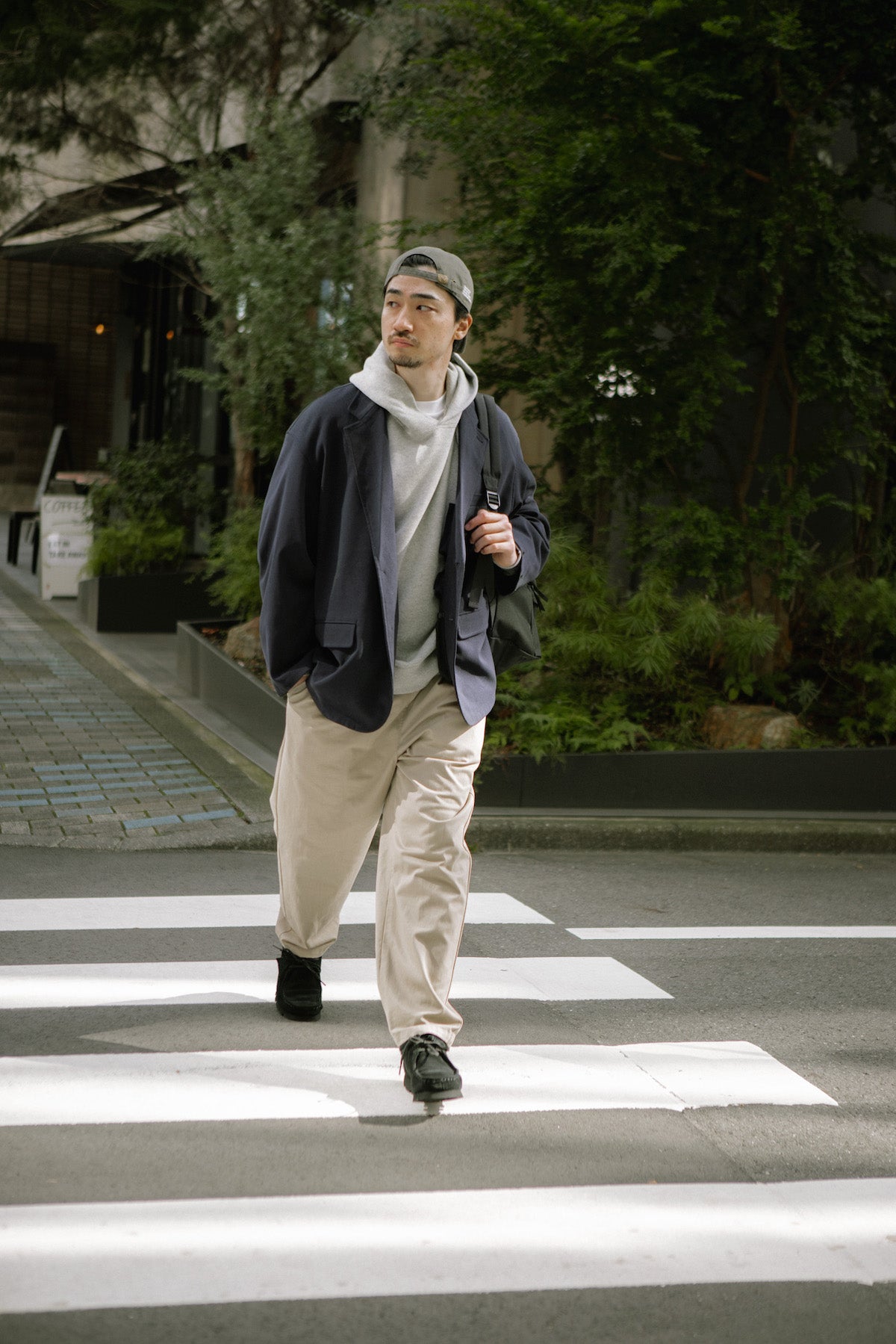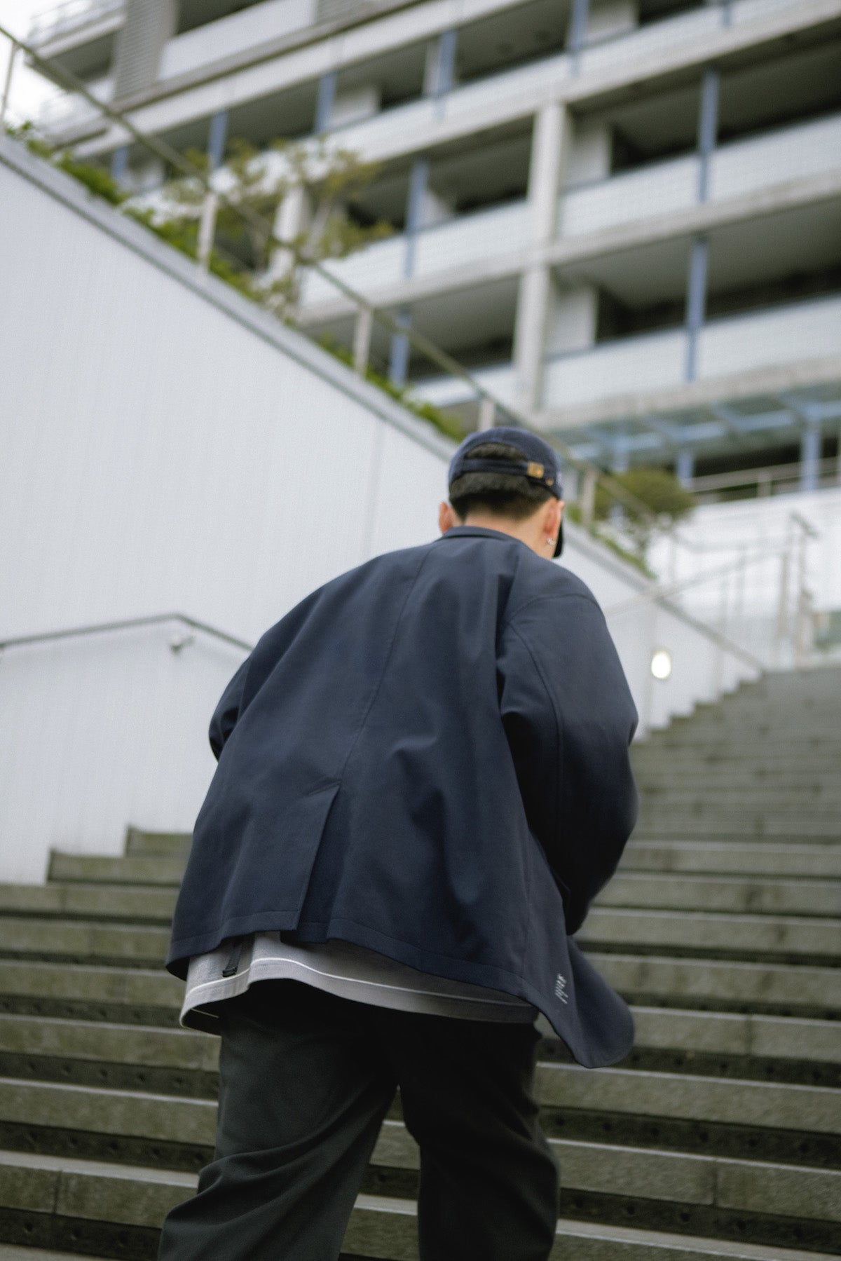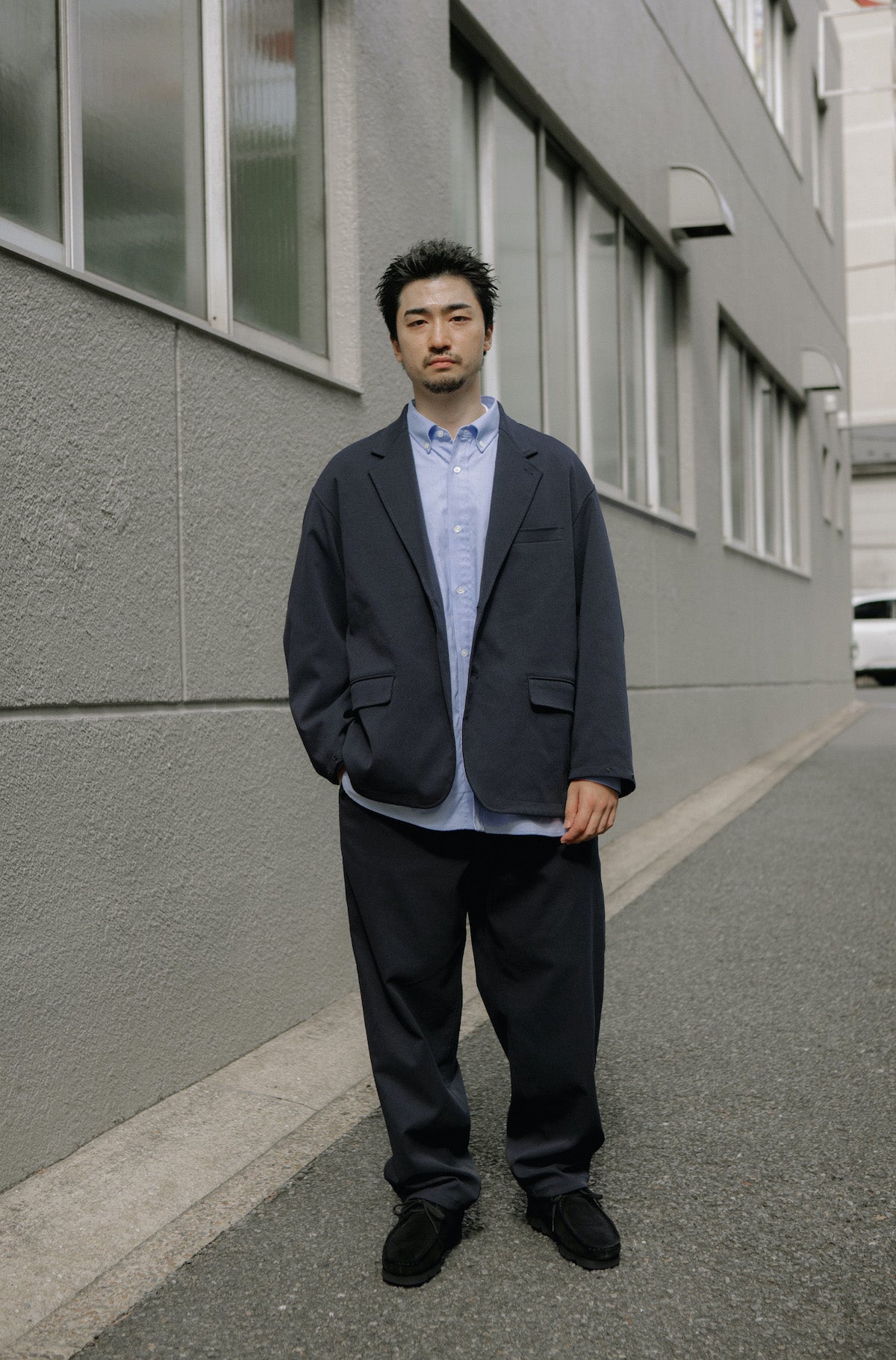 思い切り身幅をとったジャケットは、薄手のシャツから厚手のニットまで合わせられるビッグシルエット。袖部分はスナップボタンで幅を調整でき、襟はスタンドカラーになっているため、シルエットを自在にアレンジすることができます。