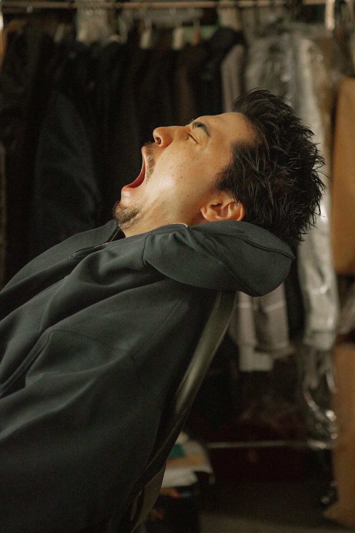 REMOTE-WORK BLOUSONは、韓国発のネックピローアパレルブランド〈Pillowdy〉の開発した襟元内臓のエアパックが内蔵され、胸ポケットに収納されたチューブから息を吹き込むことで膨らむ仕様。大容量のサイドポケットや肘裏に施したタックなど、収納力と動作性を持ち合わせます。